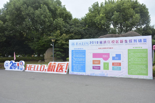 迎新期间,学校各主要道路、区域、建筑都有为新生定制的杭医Logo道旗、互动展板、横幅等,“热烈欢迎新同学”的氛围传递着温暖,宣传标语处处体现了医学生的用心,如“梦寻杭医,医者仁心;心护生命,命为圆梦”;以及只有医学生才能看懂的专业术语:“左一肋间隙往里深一寸,那里面是你”等。这些俏皮温馨的标语都给新生留下了深刻印象,也改变了身边人对医学生严肃形象的刻板印象。除此之外,校学生会在博爱楼北侧设立了新生入学留念拍摄点,免费提供新生留念照,纪念踏入杭医校园的美好第一天。同时,杭医展板心愿墙上贴满了新生对未来校园生活和人生的美好展望,成为校园里一道亮丽的风景线。